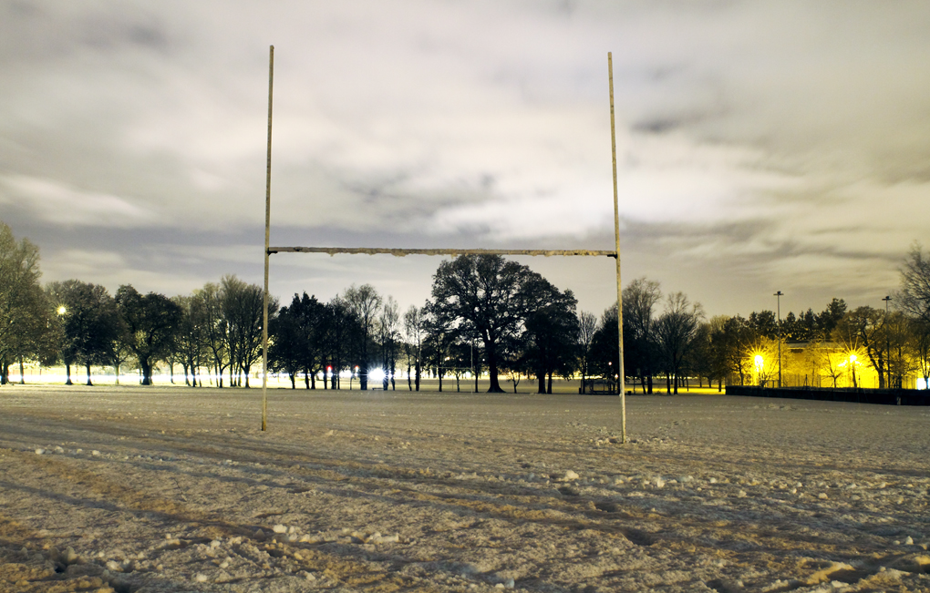 Rugby Posts in the snow at night, Eastern Leisure Centre, Cardiff