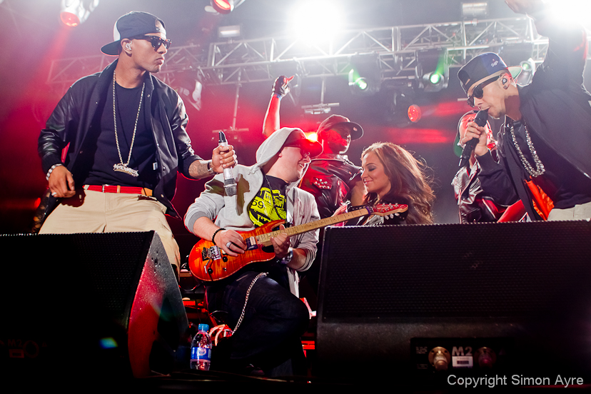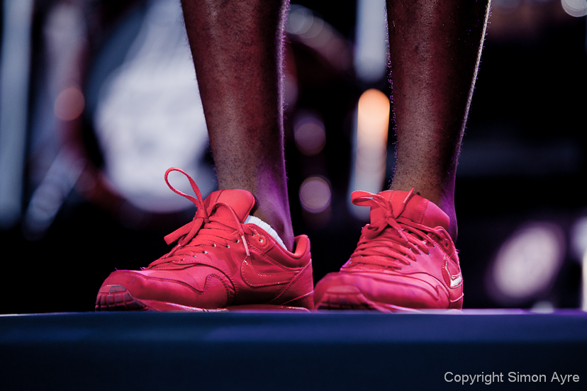 I’m getting to a point now where I’m starting to feel more relaxed in the pit at bigger shows so I can start shooting more in a style that fits with my smaller gig photos. In the first few big gigs I did I had problems relaxing enough to take the sort of photos I like to take. I don’t like to just take a photo of a singer, there’s so much more to look at when you’re shooting a gig that other people don’t notice and the things that stood out for me (apart from being a few feet away from the saturdays, obviously) at Ultrasound were without a doubt, Tinie Tempah’s trainers! Luckily I maganed to take a photo of them with my last shot before we all got kicked out of the pit. Good timing.