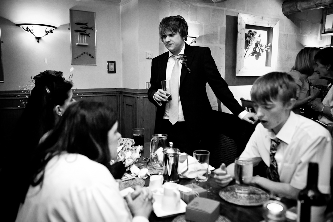 So we eventually went to the venue an hour or so after Leigh and Dan, and we met them at the bar. I left my camera in the boot of the car and let the paid photographers do their job and had a pint before the ceremony, which was quickly upon us. Helen came down the aisle to “Here Comes the Sun” and she looked amazing, the sun was shining bright and Leigh was down the front, apparently bawling his eyes out. A few moments and vows later, they walked back to the sounds of Sebastien Tellier’s La Ritournelle and applause from the crowd (and crying from one 3 year old niece of mine). So, Pimms anyone? Yes please. More Pimms? Yes please. More Pimms? Yes please! More Pimms? Ohhh I shdn’t. More Pimms? shkujhspleass. More Pimms? yssshhplsss. More Pimms? NooIbetternot. It’s the last jug. Oh I better had then. Amazing how the fear of the last jug of Pimms can sober you up, temporarily. So, the photographers have gone, I need the loo due to the amount of Pimms I’ve had and apparently delay the entrance of the bride and groom. Oh, and I’ve got my camera. The rest is a bit hazy, but most excellent. Amazing food, great people, a really good band, dancing, lovely weather, Bailey’s, cake, cheese and biscuits and a drunk man with a camera- everything you could want.